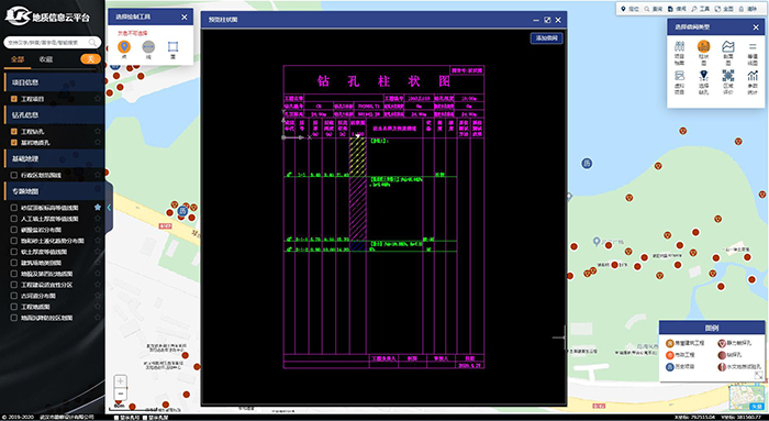 平臺(tái)基于標(biāo)準(zhǔn)化的工作流程,采用多重校審及分級(jí)管控的手段,通過(guò)配置,完成了從數(shù)據(jù)歸檔入庫(kù)到在線借閱的全過(guò)程服務(wù)與管理,滿足生產(chǎn)效率的同時(shí)保證了數(shù)據(jù)的準(zhǔn)確性及安全性。平臺(tái)支持鉆孔地層的標(biāo)準(zhǔn)化,完成了歷史存量數(shù)據(jù)的坐標(biāo)轉(zhuǎn)換,解決了因地層代號(hào)和坐標(biāo)系不統(tǒng)一而無(wú)法共享的問(wèn)題。平臺(tái)實(shí)現(xiàn)了在網(wǎng)頁(yè)端基于CAD繪制勘察圖件的功能,支持柱狀圖、剖面圖、等值線圖的自動(dòng)生成?捎嗅槍(duì)性的對(duì)研究區(qū)域鉆孔篩選過(guò)濾,使統(tǒng)計(jì)分析結(jié)果可靠度更高。平臺(tái)具有較完善的數(shù)據(jù)接口,實(shí)現(xiàn)了與公司自主研發(fā)的勘察資料處理軟件的無(wú)縫對(duì)接,兼容各種地質(zhì)專題GIS數(shù)據(jù)。不僅可直接入庫(kù)勘察軟件數(shù)據(jù),還能以項(xiàng)目和鉆孔的維度輸出涵蓋地層及試驗(yàn)信息的可在勘察軟件中直接利用的文件。